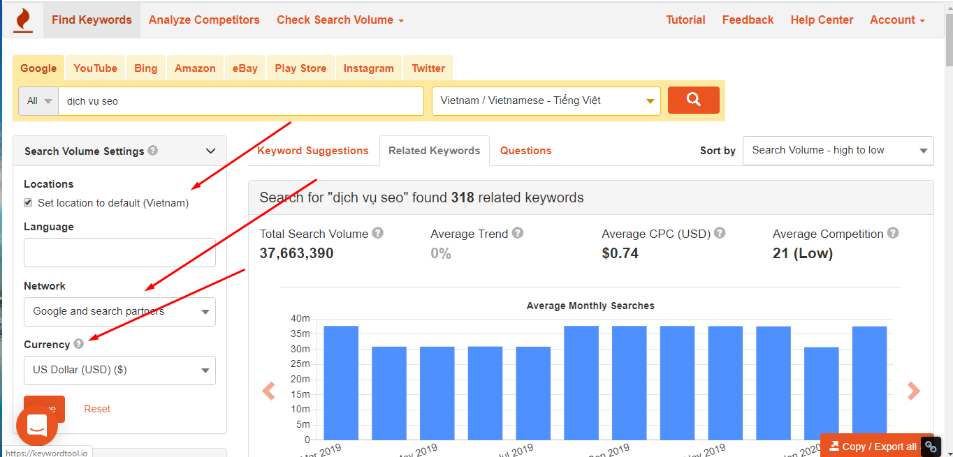 Tool này hỗ trợ nghiên cứu từ khóa không chỉ trên platform Google mà còn trên cả Youtube, Bing, Yahoo…Tuy nhiên tool này chưa hỗ trợ tiếng việt trên Amazon và Answer.